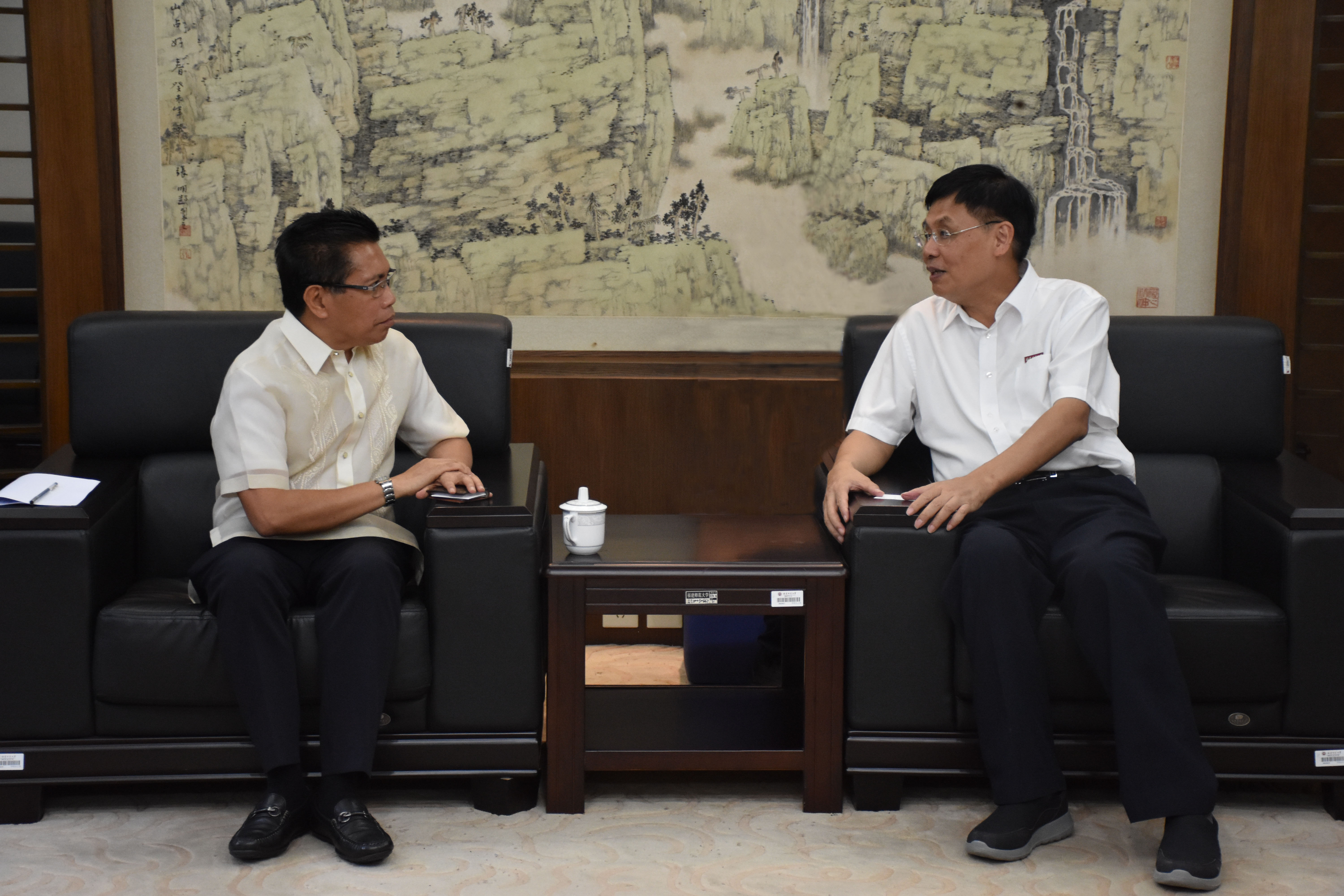 李宝银代表学校热烈欢迎付昕伟一行的来访,简要介绍了学校的办学历史、办学规模、学科发展、对外办学等方面的情况。他指出,学校与菲律宾政府、高校以及社会机构在教育、科研方面有着长期合作的历史,对促进中菲友好交流作出了积极贡献。他说,当前中菲各项交流日益广泛,不断走向深入,为学校与菲律宾有关方面的合作交流创造了更为有利的条件。他表示,目前学校在中国和菲律宾政府的关心下,在旅菲校友许明良先生的支持下,成立了专门面向菲律宾学生开展硕士教育的索莱达学院。学校将在政策、资金以及管理人员配备等方面给予倾斜支持,加快推进旗山校区研究生教学科研综合楼建设,努力为包括菲律宾籍在内的留学生提供更好的学习生活环境。
