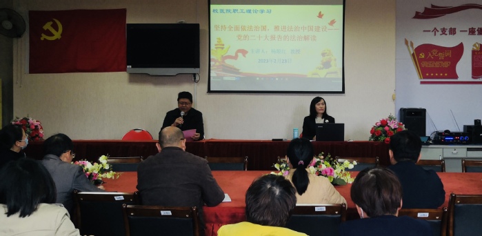 近日,校医院党委邀请校学习贯彻党的二十大精神宣讲团成员、法学院院长杨垠红教授为全体职工作题为《坚持全面依法治国,推进法治中国建设——党的二十大报告的法治解读》的报告。报告会由院党委书记赵立新主持。