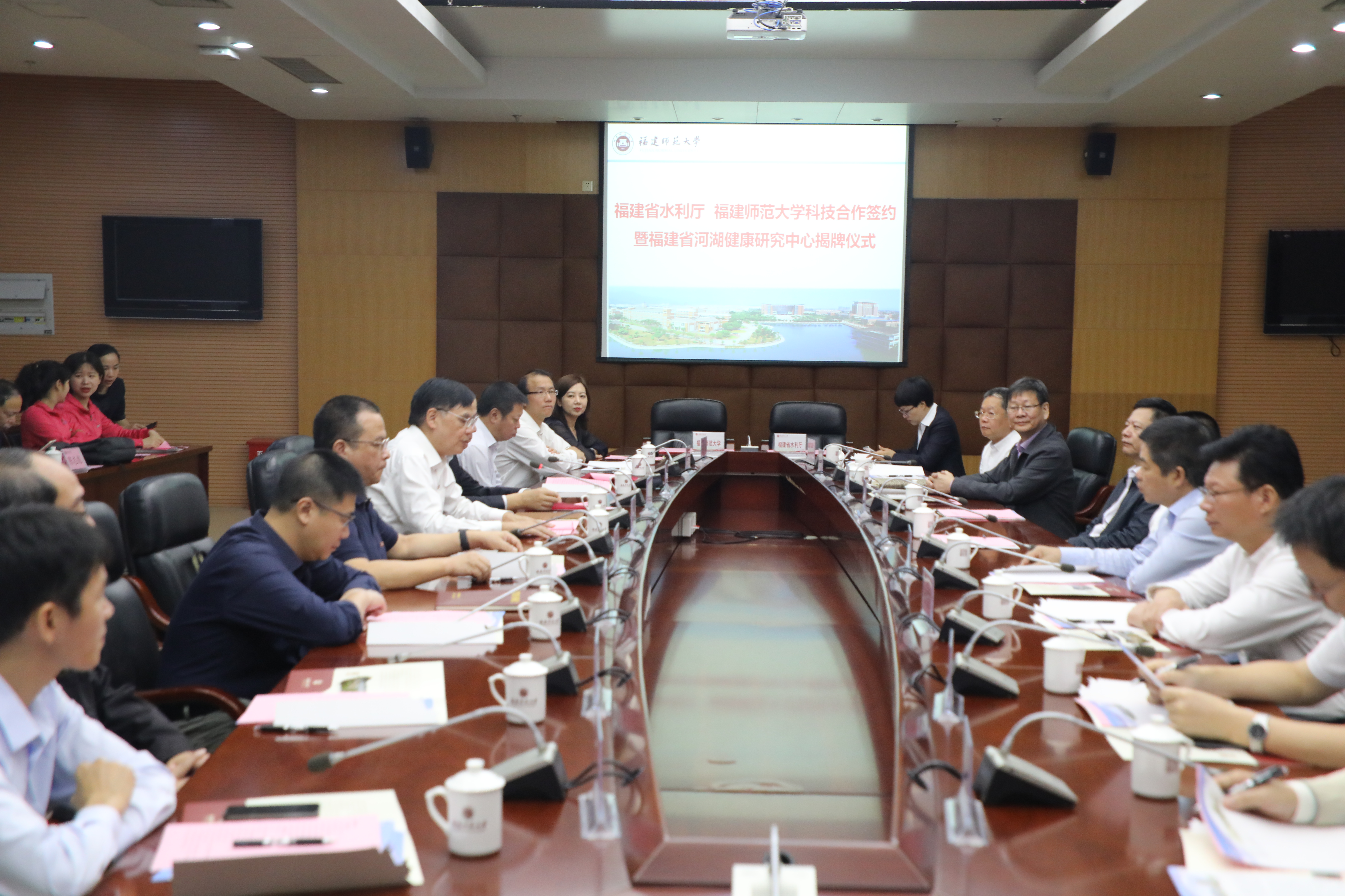 10月31日上午,省水利厅与U8·电子(中国)官方网站科技合作签约暨福建省河湖健康研究中心揭牌仪式在旗山校区第十会议室隆重举行。省水利厅厅长赖军、副厅长游祖勇,省水利水电勘测设计院党委书记郭武,校领导李宝银、王长平、杨玉盛,省水利厅相关部门负责人以及U8·电子(中国)官方网站相关部处、学院负责人和教师代表参加了会议。会议由校长王长平主持。