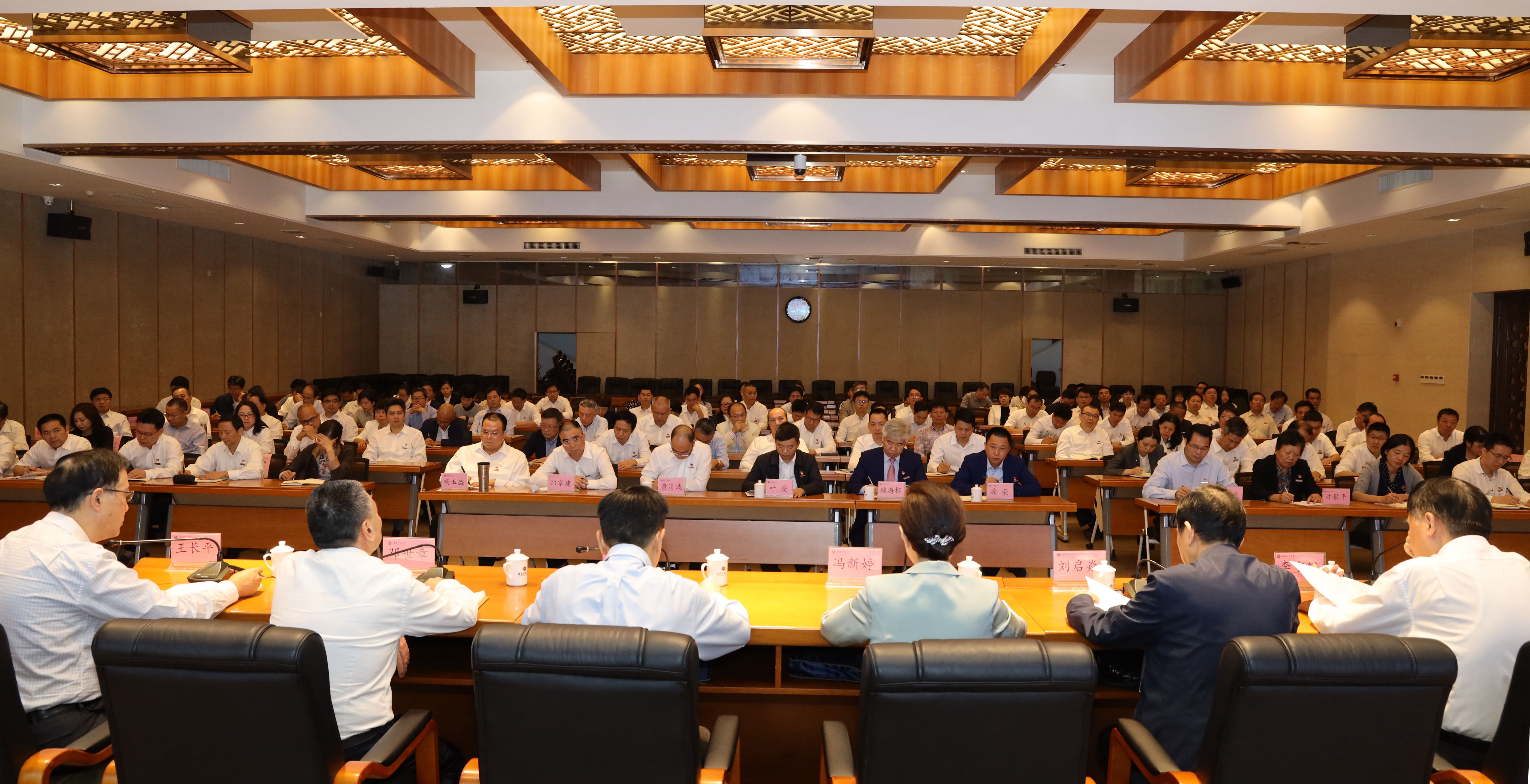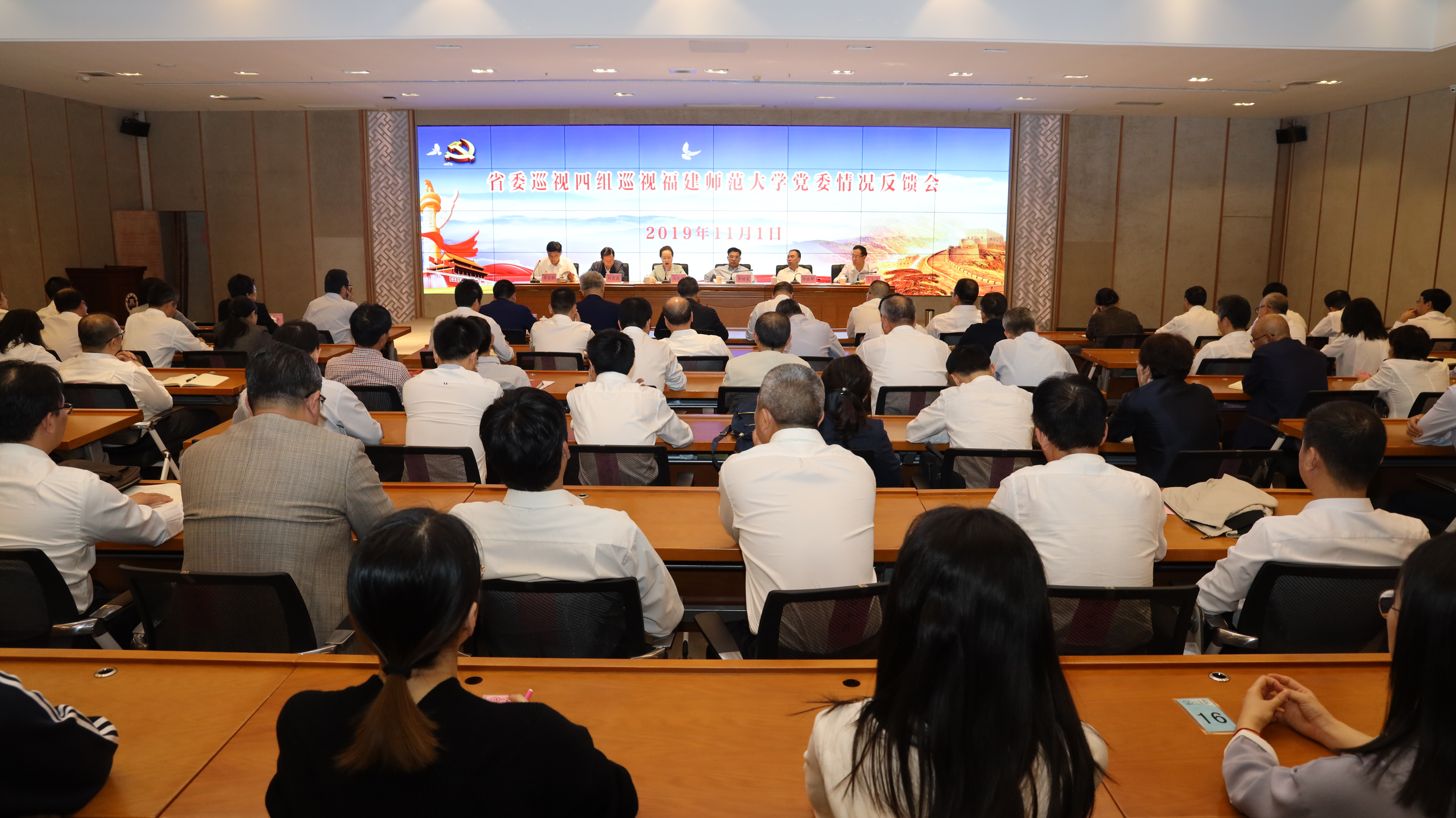 省委巡视四组,省纪委、监委第三纪检监察室,省委巡视办有关同志,校党政领导班子成员,外派厅级干部、部分原校领导,全校中层正职(含主持工作副职)干部,附属学校、校医院党政主要负责同志,师生代表参加会议。