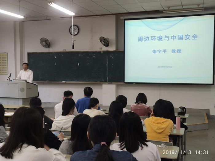 11月13日下午于旗山校区致广1-108,校党委讲师团成员、公共管理学院柴宇平教授应邀为社会历史学院师生作“周边环境与中国安全”专题报告。报告由社会历史学院党委副书记钟兴言主持。