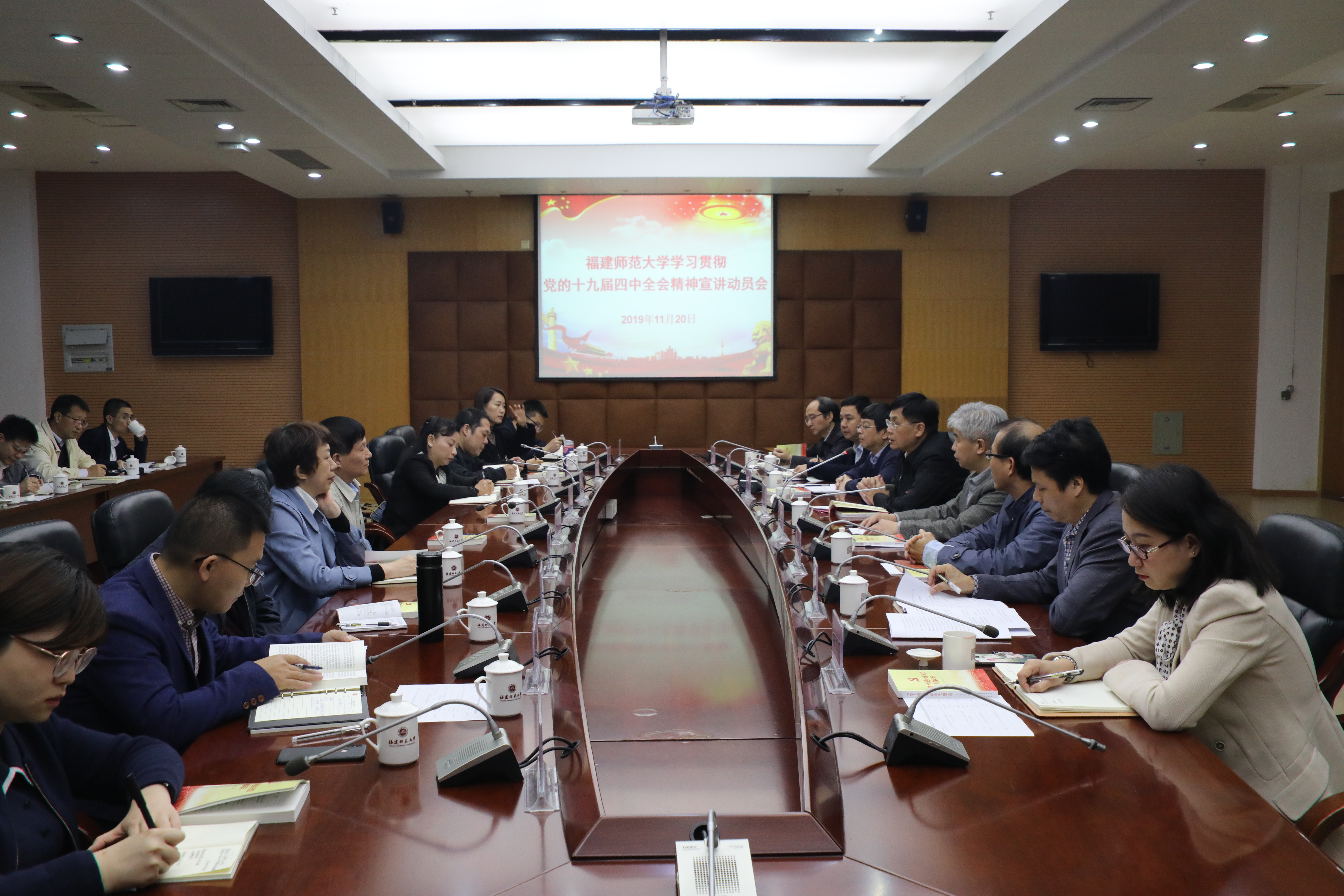 11月20日上午,U8·电子(中国)官方网站在旗山校区第十会议室召开学习贯彻党的十九届四中全会精神宣讲动员会,全面启动全校集中宣讲活动。校领导李宝银、赖海榕,校党委讲师团、青年讲师团成员代表,有关部处负责人、二级单位党组织负责人参加了会议。副校长赖海榕主持会议,校党委讲师团成员代表郑传芳教授、青年讲师团成员代表刘晓晖老师作表态发言。