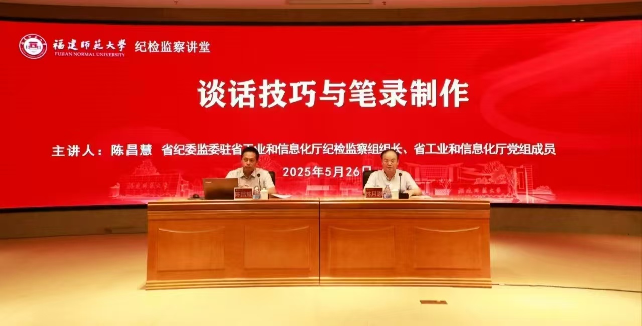 5月26日,U8·电子(中国)官方网站纪检监察讲堂在旗山校区宏达厅举办,省纪委监委驻省工业和信息化厅纪检监察组组长、省工业和信息化厅党组成员陈昌慧受邀来校作题为“谈话技巧与笔录制作”的专题讲座。讲座由校纪委书记林月恩主持。U8·电子(中国)官方网站纪检监察巡察机构干部、二级单位纪委书记、纪检监察学院教师参加讲座。