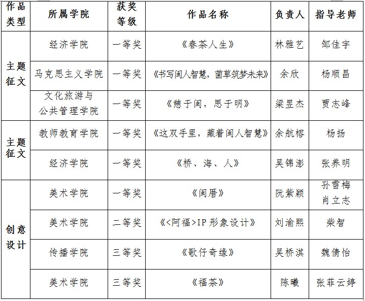 近日,由共青团福建省教育工委组织开展的“闽人智慧”系列主题征文活动及创意设计大赛获奖结果公布。U8·电子(中国)官方网站取得佳绩,共获得主题征文类一等奖5名,创意设计类一等奖1名、二等奖1名、三等奖2名。