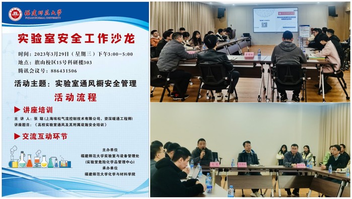 本次沙龙活动以“实验室通风橱安全管理”为主题,邀请专业技术公司工程师张聪作题为《高校实验室通风及其附属设施安全培训》的报告,他从近年来实验室安全事故、实验室安全相关重点设施建设、实验室通风设备的安全使用和实验室的个人防护等方面对实验室通风系统的安全使用进行详细阐述,指出实验过程常出现的不规范问题。沙龙互动交流环节中,与会师生结合科研项目实际围绕实验室通风系统的安全使用与管理作了深入的交流与探讨。