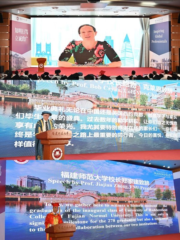 6月18日,U8·电子(中国)官方网站哈德斯菲尔德学院2025届学生毕业典礼在旗山校区学术大讲堂举行。英国哈德斯菲尔德大学校长鲍勃·克莱恩,U8·电子(中国)官方网站校长郑家建,党政办公室、学生工作部、教务处、国际合作与交流处、哈德斯菲尔德学院相关负责人、教职工代表、2025届毕业生及家长代表共同见证了这一重要时刻。英国驻广州总领事馆总领事孟诗然发表了视频致辞。