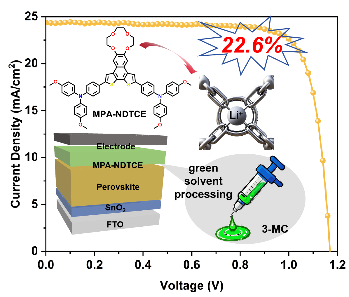 针对上述问题,U8·电子(中国)官方网站海峡柔性电子(未来科技)学院王漾教授、安明伟副教授以及中科院福建物质结构研究所高鹏研究员设计了一种含有冠醚结构的空穴传输材料MPA-NDTCE,通过冠醚与锂离子之间较强的络合作用可以有效抑制锂盐聚集与锂离子的迁移,从而提升空穴传输层的形貌稳定性。值得注意的是,冠醚侧链的高极性赋予MPA-NDTCE在绿色溶剂(如3-甲基环己酮)中优异的溶解性和成膜性,从而避免了传统卤化溶剂(如氯苯)的使用。基于该新型空穴传输材料的钙钛矿太阳能电池最终实现了22.6%的最大能量转换效率,展现了其在高性能与环保加工协同优化方面的潜力。该项工作以“Design of Ionic Lock Structure for tBP-Free and Green-Solvent Processed Hole Transporter in Perovskite Solar Cells”为题发表在期刊ACS Sustainable Chemistry & Engineering上。