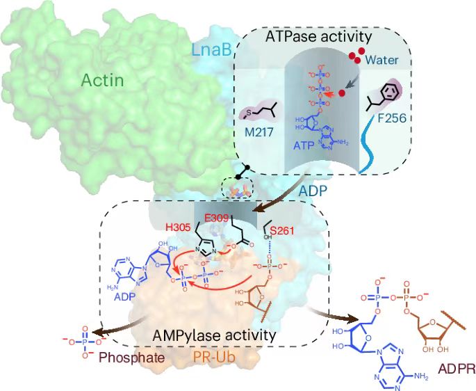 嗜肺军团菌是导致人类军团病的致病菌,其感染肺巨噬细胞并在宿主细胞内形成独特的膜泡结构来实现生存和繁殖。嗜肺军团菌利用SidE家族效应蛋白催化一种不依赖E1和E2的非典型泛素化过程,促进嗜肺军团菌膜泡的成熟。该非典型泛素化在对应的特异去修饰效应蛋白DupA/B的作用下产生具有细胞毒性的磷酸核糖化泛素分子(PR-Ub)。去年,U8·电子(中国)官方网站生命科学学院欧阳松应团队与美国普渡大学罗招庆教授团队合作揭示了军团菌通过效应蛋白LnaB和MavL催化的级联反应,维持感染细胞内的泛素稳态。其中,LnaB是一种依赖于宿主肌动蛋白的新型腺苷酸化酶(Phosphoryl-AMPylase),催化PR-Ub磷酸根的腺苷酸化(AMPylation)修饰生成ADPR-Ub。该工作解析了效应蛋白LnaB的系列复合物结构,详尽地解析了LnaB通过宿主肌动蛋白依赖性激活,催化PR-Ub发生磷酰基腺苷酸化反应的详细分子机制。该工作揭示了腺苷酸化修饰反应的新型催化机制,拓展了对酶催化机制的理解,同时深化了嗜肺军团菌感染致病机制的认识,为研究SHxxxE家族毒素的作用机制奠定了基础,也为开发新型抗感染药物提供了重要的理论依据。