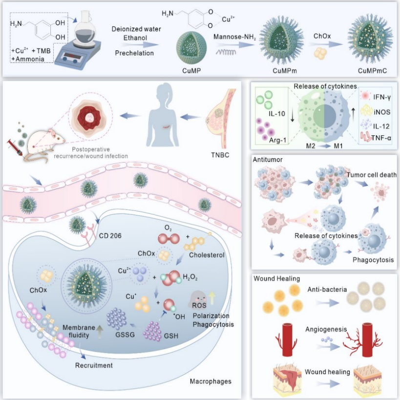 术后复发和感染仍然是乳腺癌有效康复的主要障碍,通常由胆固醇介导的巨噬细胞功能障碍驱动。为了解决这些问题,近期U8·电子(中国)官方网站生命科学学院曾雪梅团队开发基于免疫治疗与纳米技术的创新融合,通过铜-多巴胺螯合和自聚合构建CuMPmC的多功能纳米平台。该纳米平台用甘露糖功能化,选择性靶向M2样巨噬细胞,并装载胆固醇氧化酶(ChOx)。CuMPmC通过ChOx介导的氧化消耗巨噬细胞膜胆固醇,增强质膜流动性,从而促进巨噬细胞趋化。同时,ChOx产生的H2O2驱动铜介导的芬顿样反应产生适度的活性氧(ROS),同时消耗肿瘤微环境中的谷胱甘肽。这种双重作用使巨噬细胞向促炎性M1表型分化,增强对肿瘤细胞和病原体的清除。实验表明,CuMPmC可显著降低术后肿瘤复发和感染。这些发现强调了胆固醇代谢在巨噬细胞功能重编程中的关键作用,并为乳腺癌术后治疗提供了有希望的免疫治疗策略。