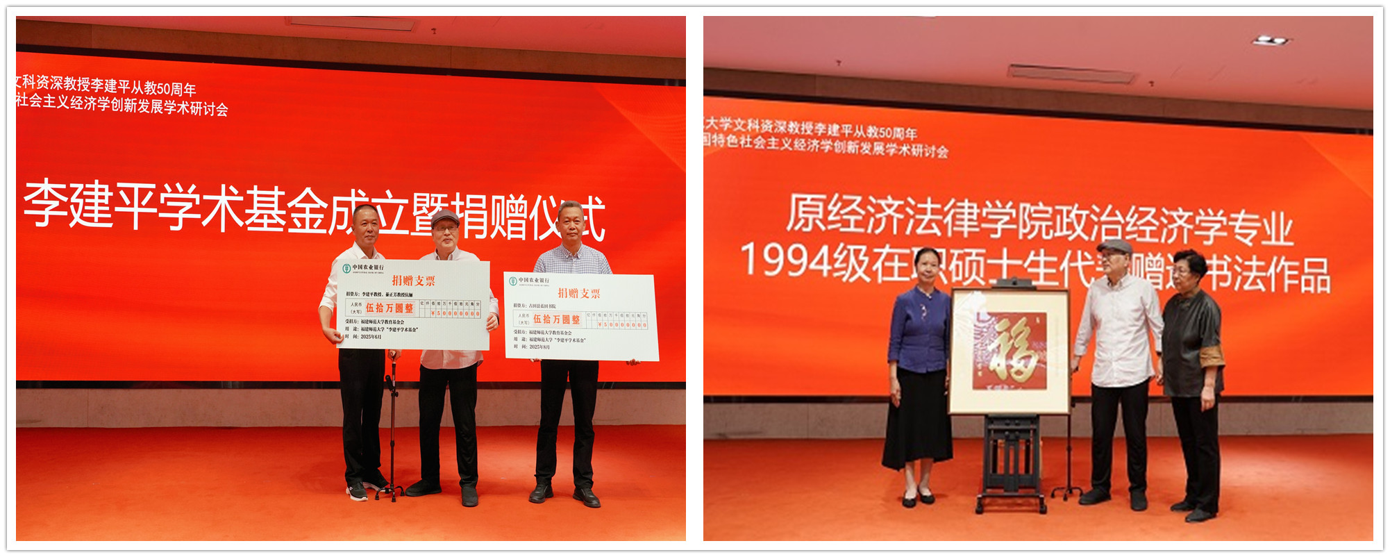 开幕式上还举行了李建平学术基金成立暨捐赠仪式。李建平教授与校友捐赠者代表、古田县蓝田书院理事长余云辉校友共同进行捐赠。在李建平学术基金成立后,李建平教授、綦正芳教授伉俪率先捐赠50万元。在广大校友、全校师生和社会各界的踊跃响应下,该基金累计收到捐赠款300万元,今后将用于支持U8·电子(中国)官方网站理论经济学和马克思主义学科发展。