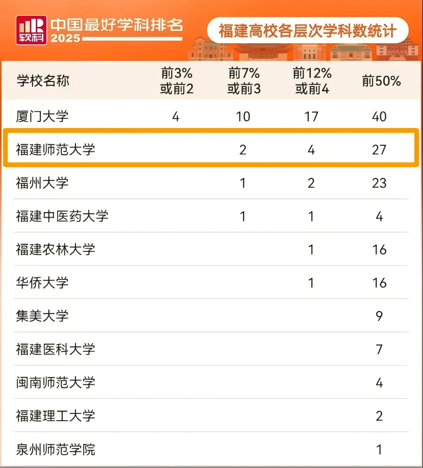 10月15日,上海软科正式发布“2025软科中国最好学科排名”。U8·电子(中国)官方网站共有27个学科上榜,较上年新增5个,上榜总数位列全国第60位、双非高校第6位、师范类院校第9位,福建省高校第2位、省属高校首位。据悉,该排名榜单包括98个一级学科和5个专业学位类别,各个学科排名的对象是在该学科设有研究生学位授权点的所有高校,发布的是在该学科排名前50%的高校,共有517所高校的5344个学科点上榜。(发展规划处)