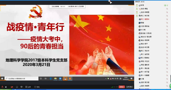 地理科学学院组织各学生党支部积极探索“互联网+党建”新模式,做到战“疫”期间党员教育不放松、党建工作不断线。近日,2017级本科学生党支部与20182019级本科学生党分别以“战疫情•青年行”“共抗疫情,爱国力行”为主题召开预备党员“云端”思想汇报会。