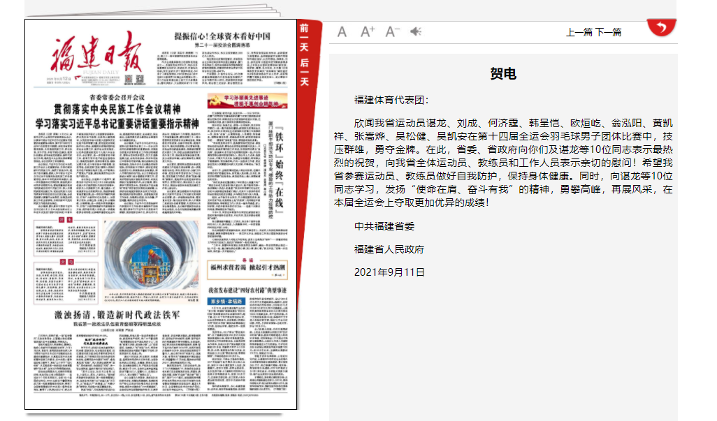 赛后,中共福建省委、福建省人民政府第一时间发去贺电,向福建体育代表团及谌龙、韩呈恺、欧烜屹、吴松健等10位运动员表示热烈的祝贺和亲切的慰问。