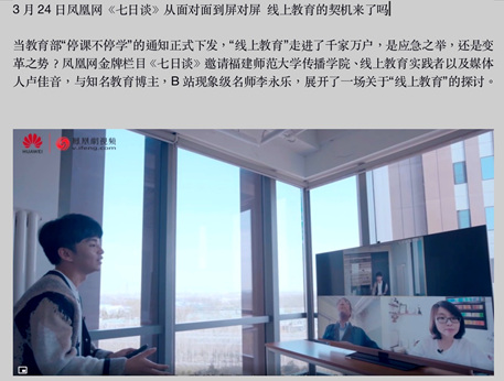 她还应邀在凤凰网《七日谈》节目中向全国网友分享线上教学经验。内容包括:知识萃取,绘制认知地图;微信群互动,搭好学习脚手架,为能力迁移建构模拟场景;慕课堂讨论区交流,提高学习能见度;慕课数据分析,适切引导;知识复盘,培育属于个人的知识树;每周视频录制,强化训练,能力掌握进度清晰可见;问卷调查,了解同学适应情况,及时调整等。