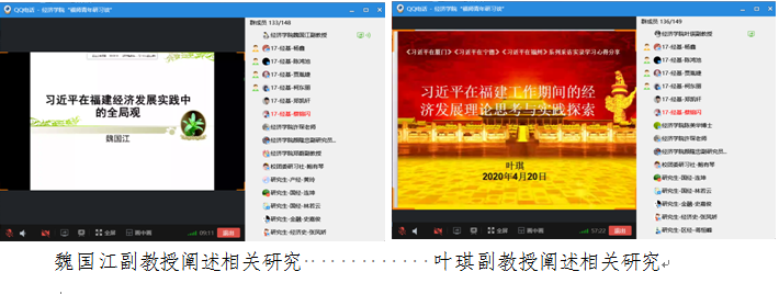 主讲人魏国江副教授和叶琪副教授分别从经济发展的角度作了题为《习近平在福建经济发展实践中的全局观》和《习近平在福建工作期间的经济发展理论思考与实践探索》的学术分享。