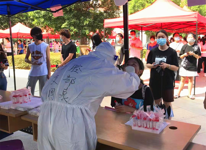 本学期初,学校已对全校师生员工开展了全员核酸检测,保障了新学期顺利开学。面对本轮来势汹汹的疫情,校医院工作人员坚守抗疫防线,连续加班加点毫无怨言。为及时完成检测任务,在第三方核酸检测机构人员紧缺的情况下,校医院组织党员干部和广大医务人员参与到检测工作中。医务人员冒着高温和烈日,穿着防护服,戴着口罩和面罩,一干就是几个小时,虽已全身湿透、气咽氧少,但毫不退缩。大家纷纷表示:“疫情形势严峻的当下,守护师生健康,我们义无反顾。”“在学校疫情防控工作中,医务人员必当是最为坚实和可靠的守门员,疫情不止,我们奋斗不息;战斗不止,我们绝不收兵”。
