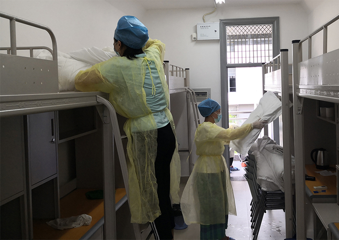 9月的福州还非常炎热。学校监测点没有电梯,为了让学生早一小时住进房间,早一分钟吃上饭,工作人员上上下下一路小跑,大汗淋漓,但他们毫不惧怕,没有怨言,勇敢挑起疫情防控工作的重担。从前台登记、房务整理、床单换洗、消毒,到送餐、送生活用品等,旗山教育培训中心的9名职工已在岗位上连续超负荷工作长达几十个小时。