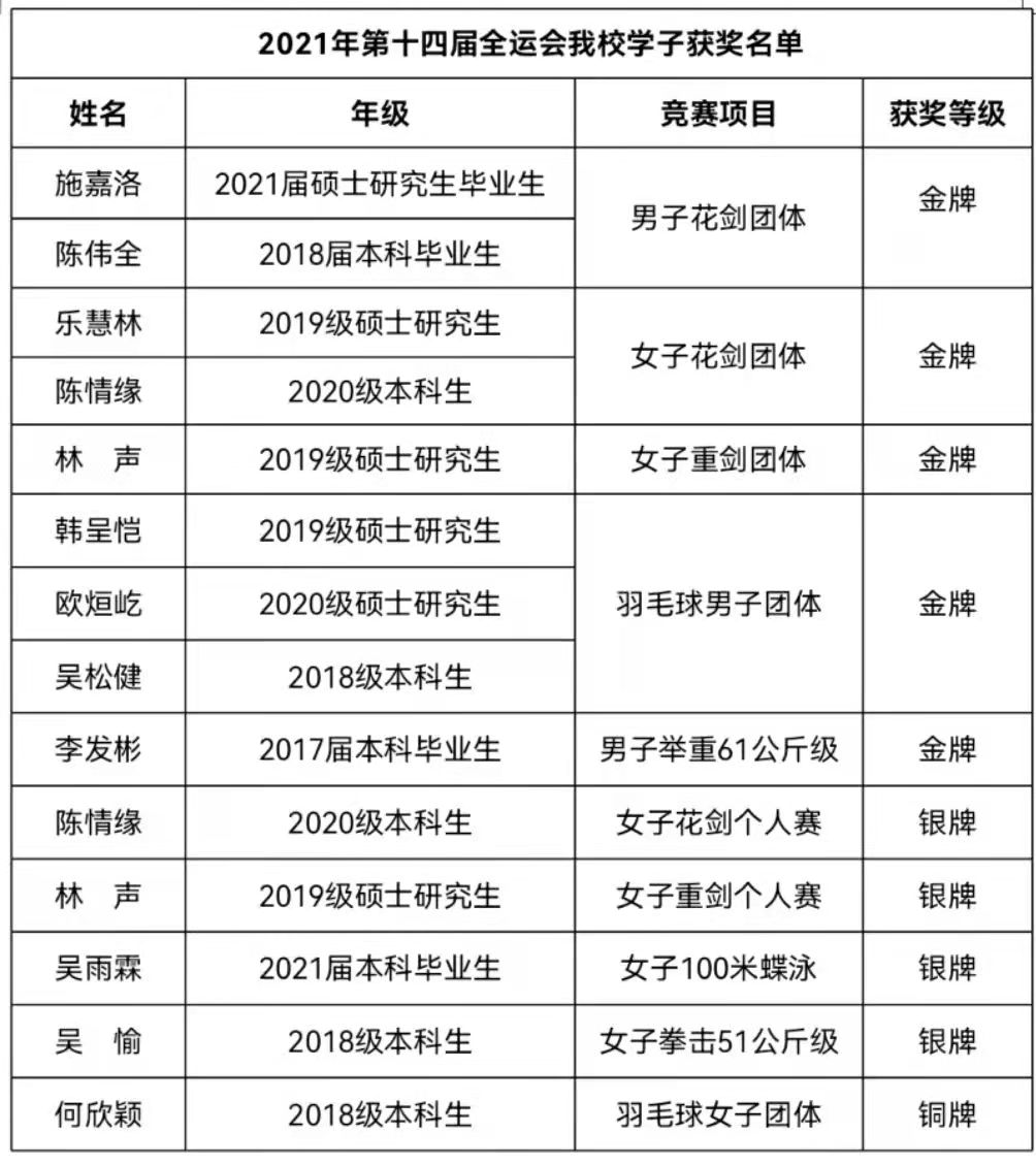 9月27日晚,中华人民共和国第十四届运动会闭幕。在为期13天的比赛时间里,U8·电子(中国)官方网站学子助力福建省体育代表团斩获5金4银1铜,充分展示了U8·电子(中国)官方网站学子顽强拼搏、自强不息的精神风貌。(体育科学学院)