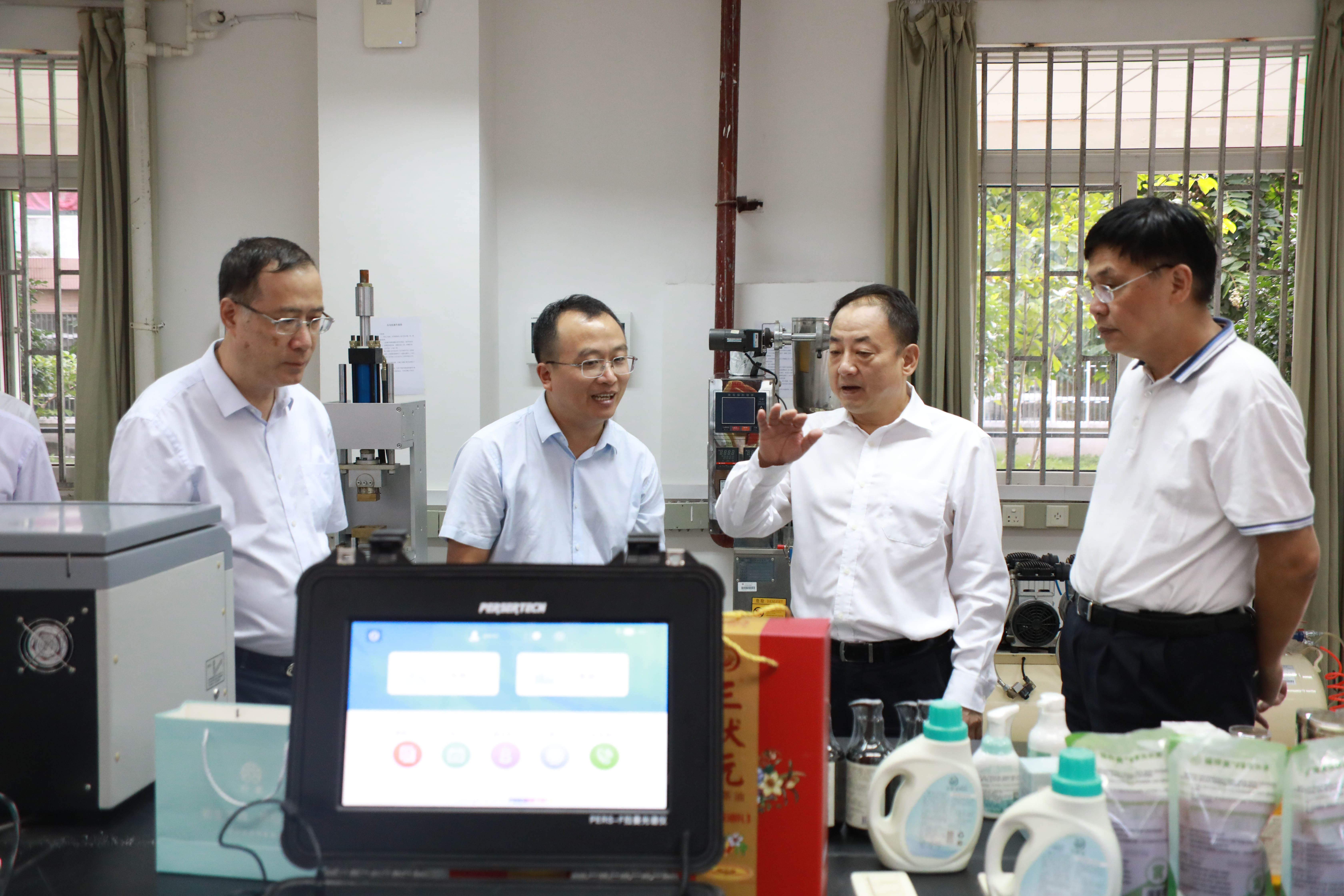 在化学与材料学院,陈秋立厅长一行走访看望了省科技特派员代表卢玉栋副教授,听取了卢玉栋副教授关于油茶产业科技扶贫项目的情况介绍,对卢玉栋通过油茶产业科技创新带动当地农民增收、产业发展表示高度的肯定,希望学校充分发挥学科、人才、科研优势,持续开展特派员工作,促进人才下沉、科技下沉,将创新的动能送进企业、带到田间,助力产业转型,服务乡村振兴,真正把论文写在田野大地和工厂车间。