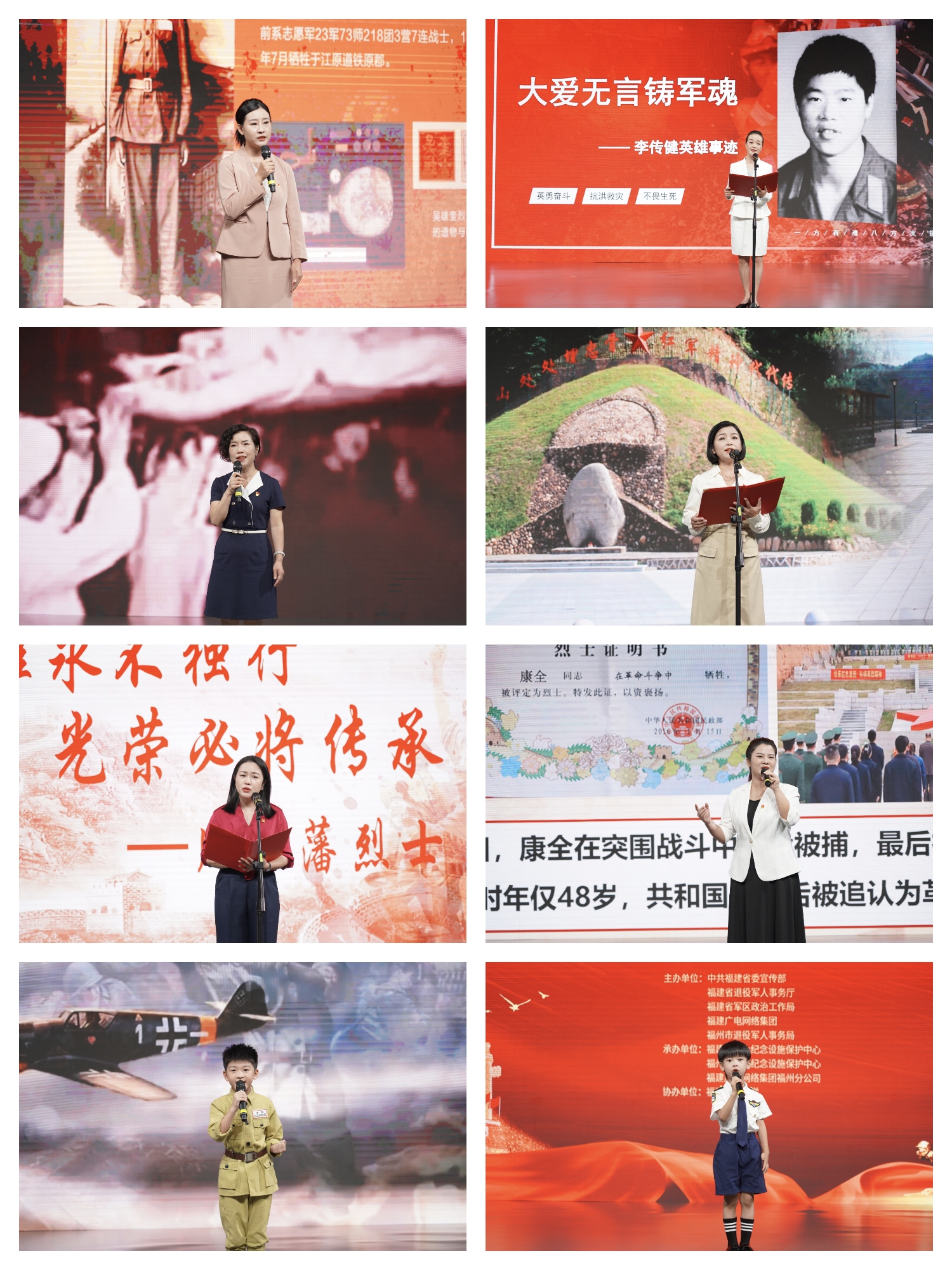 宣讲会上,6位宣讲员分别以烈士亲友或烈士纪念设施保护工作人员的身份,生动讲述烈士感人事迹。牛晨讲述闽籍抗美援朝烈士吴雄奎壮烈牺牲70年后魂归故里的感人故事;曹明讲述烈士李传健为救落水群众牺牲的故事;林丽红讲述其父亲、抗美援越老兵林在金,主动请缨参加唐山大地震救援牺牲的事迹;项氏后人项敏讲述项家冒死掩埋松毛岭战役烈士遗体的事迹;周微微讲述其祖父周裕藩烈士组建与领导平潭第一支革命武装——平潭抗日游击队的事迹;康智敏讲述其家族先后10多位前辈走上革命道路,红色基因代代相传的故事。活动中,2位小朋友深情带来诗朗诵《那支钢笔》《有国才有家》,用稚嫩的童声讲述了抗美援朝随军记者用钢笔记录志愿军保家卫国的感人故事,表达了少年儿童真挚的爱国情怀,感动了现场的所有观众。