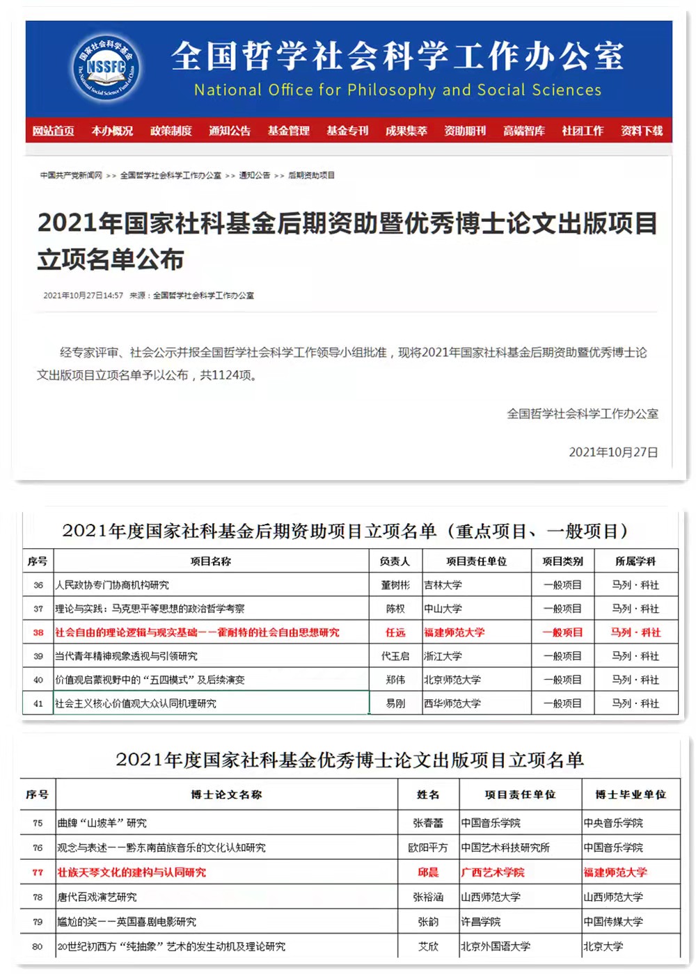 10月27日,全国哲学社会科学工作办公室公布了2021年国家社科基金后期资助暨优秀博士论文出版项目立项名单。U8·电子(中国)官方网站马克思主义学院教师任远的《社会自由的理论逻辑与现实基础——霍耐特的社会自由思想研究》获国家社科基金后期一般项目立项资助,2016级音乐与舞蹈学专业邱晨的博士学位论文《壮族天琴文化的建构与认同研究》获优秀博士论文出版项目立项资助(指导教师:陈新凤教授)。