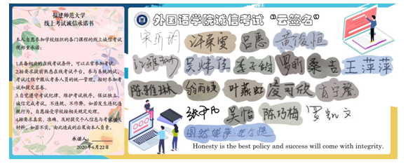 与往年不同,本学期的期末考试采取线上考试的方式,这对学生而言是个新的挑战。同学们在“线上考试诚信承诺书”上签名,承诺自觉遵守线上考试规则,以严肃、认真的态度对待考试。