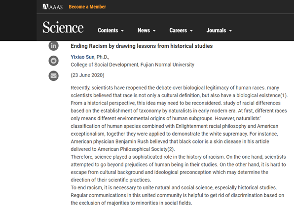 6月23日,社会历史学院博士研究生孙一笑撰写的学术评论“ Ending Racism by drawing lessons from historical studies”在国际顶级刊物Science第368卷(第6496期)的eLetters栏目刊登。