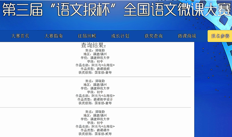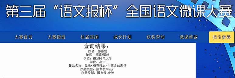 近日,由中国语文报刊协会、语文报社联合举办的第三届“语文报杯”全国语文微课大赛结果揭晓。文学院2019级学科教学(语文)专业学生郑晓勤荣获初中学段微课视频国家级一等奖、初中学段微课教学设计国家级一等奖、初中学段微课课件国家级二等奖;郭雅雪同学荣获高中学段微课教学设计国家级一等奖。