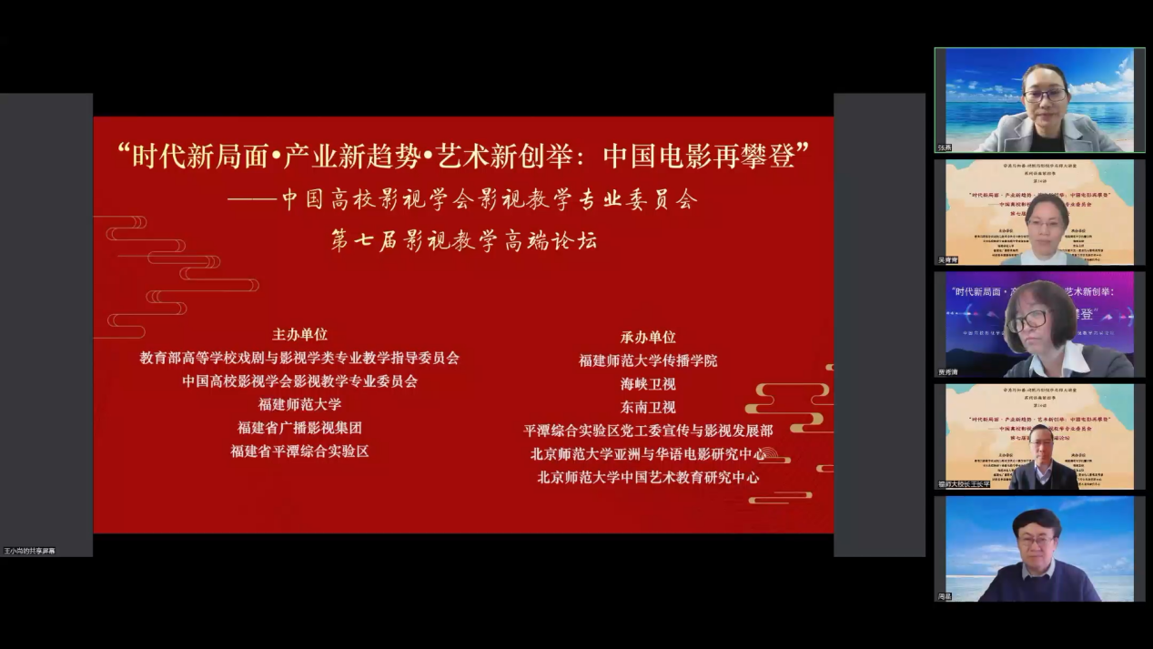 11月20日,“审美与向善:戏剧影视名师大讲堂”第四季第十四讲暨中国高校影视学会影视教学专业委员会第七届影视教学高端论坛隆重举行。该论坛由U8·电子(中国)官方网站与教育部高等学校戏剧与影视学类专业教学指导委员会、中国高校影视学会影视教学专业委员会、省广播影视集团、平潭综合实验区联合主办,U8·电子(中国)官方网站传播学院与海峡卫视、东南卫视、平潭综合实验区党工委宣传与影视发展部、北京师范大学亚洲与华语电影研究中心、北京师范大学中国艺术教育研究中心共同承办。论坛采取线上视频会议形式,并在哔哩哔哩网站和快手平台全程直播,3000人在线参与。
