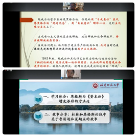 最后,李建平教授对本次活动进行总结,他指出,本次读书会联合了省内外三所高校四家单位,涵盖了本硕博士三个层次的学生,每个单位就“一个阶段,一个故事,一本名著”展开论述,是一次主题好、格局好、形式好的读书会。此次读书会还呈现出四个特点:一是论述的过程和表现的形式别出心裁;二是展示了一定的理论深度,尤其在历史唯物主义基本原理和方法论的辩证分析上;三是在论述过程中做到了理论与现实的结合;四是同学们的发言情感真挚,表现了对马克思主义深厚的热爱之情。他希望同学们通过对《资本论》创作史的研究,加强对马克思主义理论的学习,树立坚定的立场和科学的信仰,在新时代进一步推进伟大的事业,在马克思主义道路上奋勇前进。