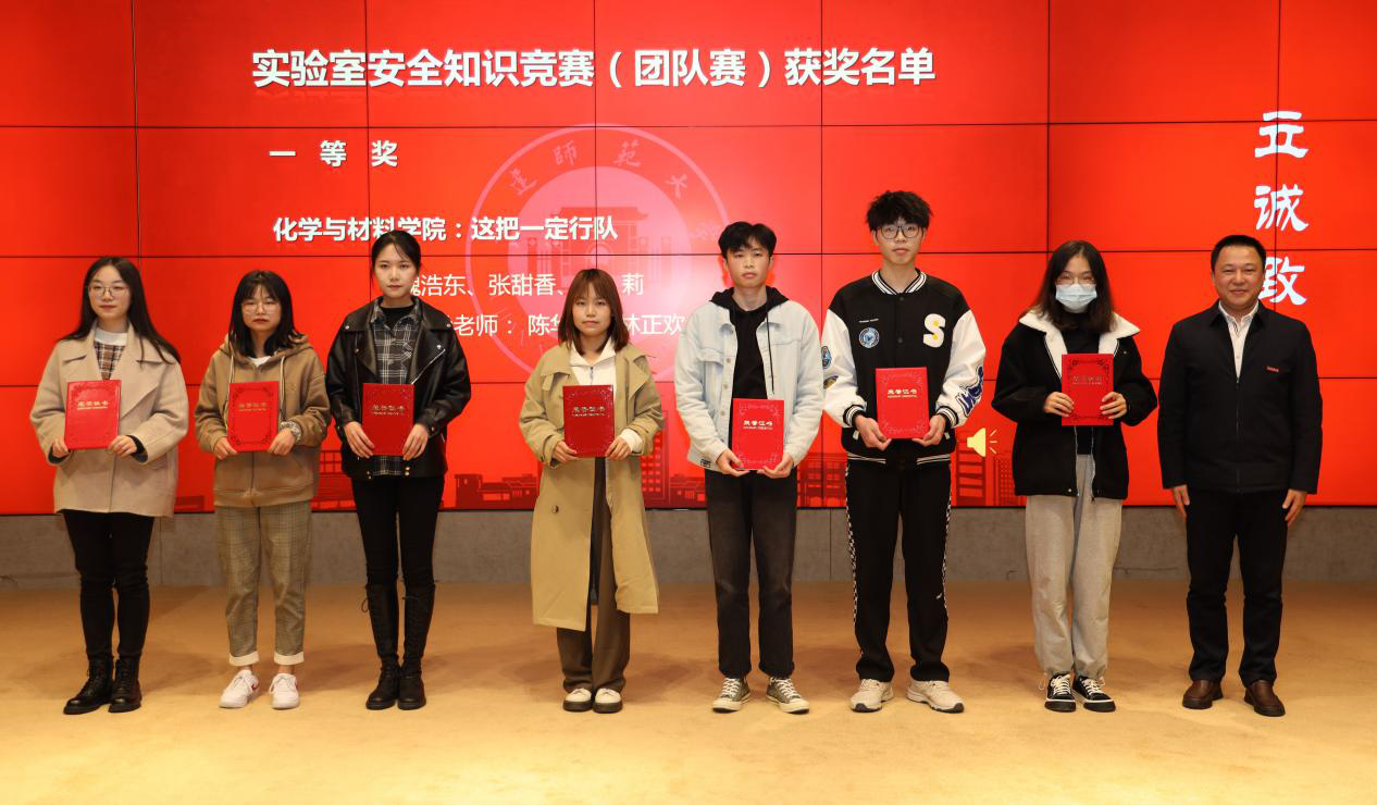 在实验室安全知识竞赛(团队赛)中,来自11个单位的研究生代表队,经过知识问答、隐患识别、试剂分类、应急处置4个赛段的激烈角逐,最终化学与材料学院代表队获得桂冠。闭幕式上,公布了2021年实验室安全宣传月研究生实验室安全知识竞赛、实验室安全微视频大赛、安全信息牌设计竞赛活动获奖名单,并为获奖团队和个人颁发了获奖证书。