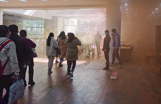 演练现场,各厅库老师在听到消防警报声时立即停止业务工作,组织本厅库读者沿安全通道的路线迅速撤离,火情发生三分钟内馆内所有人员撤离到安全地带。演练过程流畅有序。