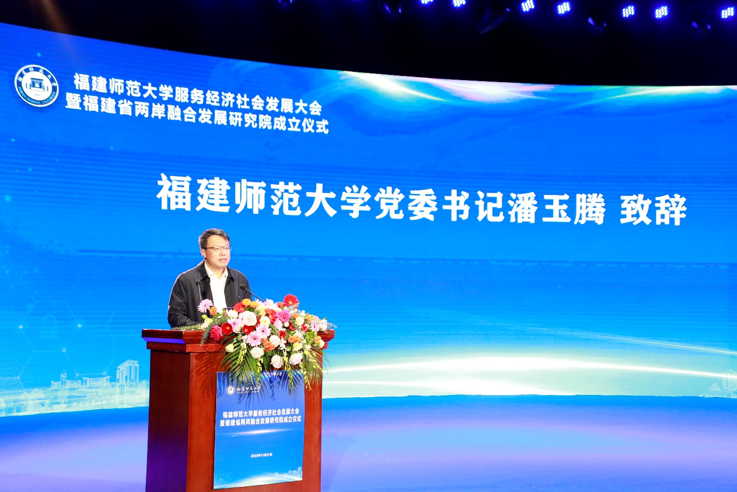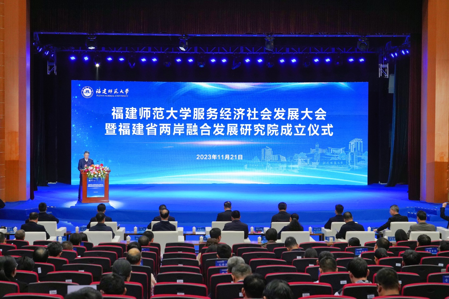 11月21日,U8·电子(中国)官方网站在旗山校区学术大讲堂举行服务经济社会发展大会暨福建省两岸融合发展研究院成立仪式。省台港澳办副主任陈志勇,省教育厅党组成员、副厅长王飏,中国联通福建省分公司副总经理杨暐,龙岩市稀土开发有限公司总经理童以和,福州市闽侯县县长王建生、永泰县县长陈金友,泉州市泉港区区长杨凤翔,龙岩市生态环保局、城市管理局,闽侯县教育局、永泰县教育局等政府部门代表,相关行业企业代表,U8·电子(中国)官方网站党政领导班子成员、全校中层干部、学科带头人、学位点负责人、学院学科与平台建设办公室负责人和教师代表等参加了会议。会议由副校长陈庆华主持。