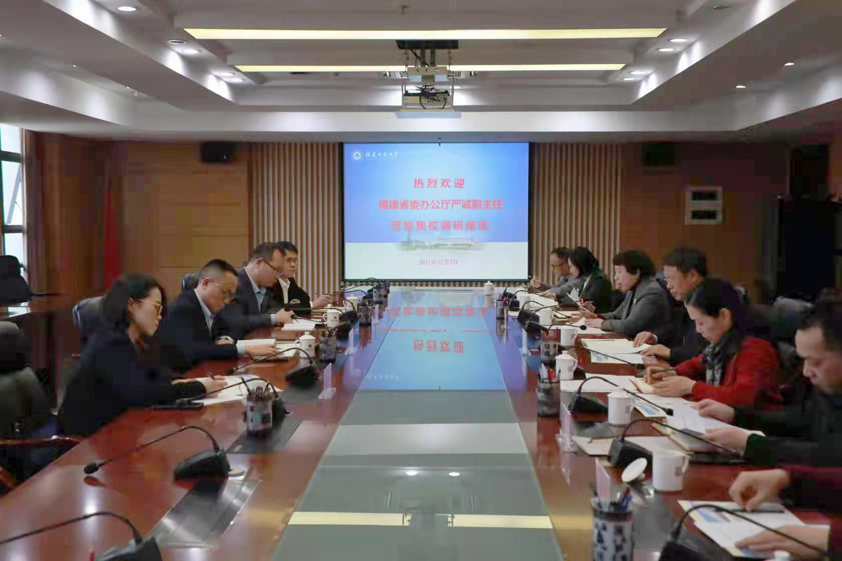12月7日,中共福建省委办公厅副主任、法规局局长严诚一行4人来校调研福建省党内法规实施评估中心工作。校党委书记潘玉腾、副书记陈晓红,党政办公室、社会科学处、法学院等单位负责人,以及中心研究人员参加了调研座谈会。会议由校党委副书记、福建省党内法规实施评估中心主任陈晓红主持;评估中心执行主任林旭霞教授汇报近期工作情况以及今后工作打算。