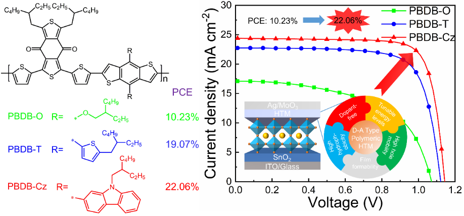 近日,在前期工作(Adv. Energy Mater.2019, 10, 1903146)的基础上,U8·电子(中国)官方网站化学与材料学院甄红宇课题组再次在国际学术期刊《Advanced Energy Materials》(IF=29.386)上,发表题为《Donor-Acceptor Type Polymer Bearing Carbazole Side Chain for Efficient Dopant-Free Perovskite Solar Cells》的研究论文。该论文创新性地将咔唑作为侧链引入BDT-BDD交替共轭聚合物,利用主链和侧链空穴传输功能基元的协同效应,提高聚合物空穴传输材料的空穴传输性能。该论文以U8·电子(中国)官方网站为第一单位,U8·电子(中国)官方网站化学与材料学院博士生游国峰为第一作者,甄红宇研究员为通讯作者。该研究工作得到国家自然科学基金和福建省自然科学基金等项目的资助。