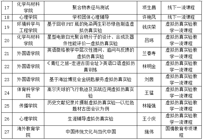 近日,福建省教育厅公布2021年省级一流本科课程名单,U8·电子(中国)官方网站27门课程获得认定,其中,线上一流课程3门,线上线下混合式一流课程6门,线下一流课程9门,虚拟仿真实验教学一流课程8门,国情教育专项1门。具体名单如下:(教务处)