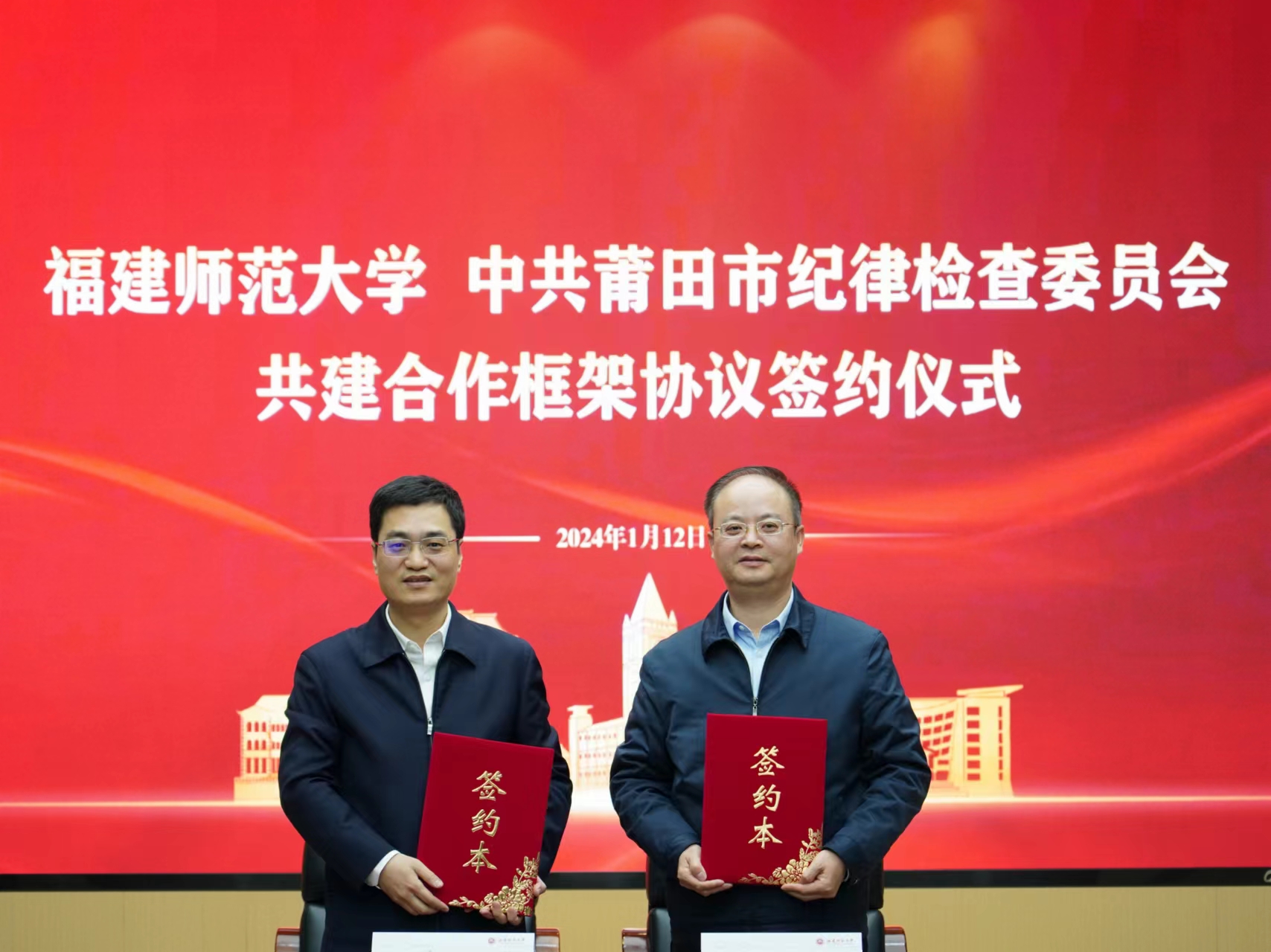 1月12日,莆田市纪委书记、市监委主任林建伟带领市纪委相关负责人郭志诚、潘福来、林清、陈敏等来校交流座谈并签订合作框架协议。校党委书记潘玉腾、校长王长平会见林建伟一行。校纪委书记、省监委驻U8·电子(中国)官方网站监察专员林月恩,纪委(监察专员办)综合室、纪检监察室及法学院、纪检监察学院负责人,教师代表参加签约仪式。