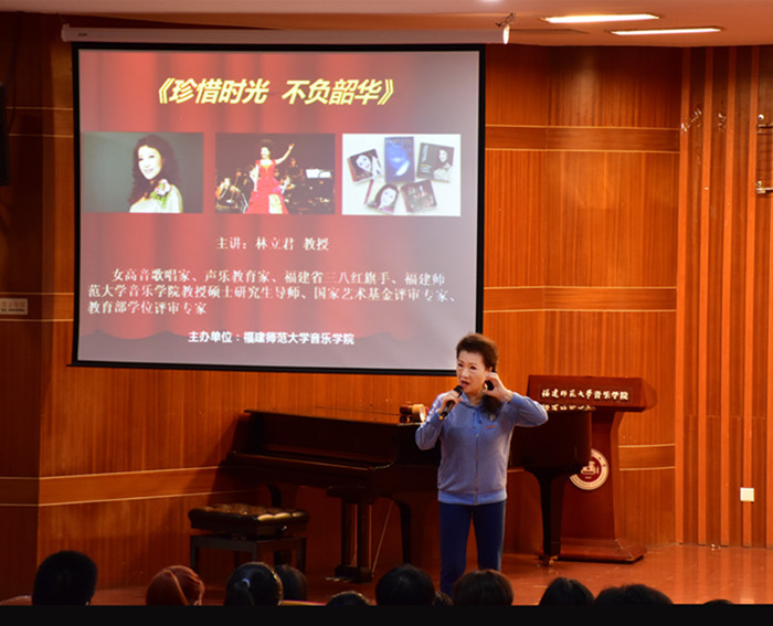 讲座中,林立君与同学们分享了自己从学习体操到舞蹈再到声乐的成长历程,以及在艺术实践与教学实践中积累的丰富经验。她创编并展示了“寓教于形以动辅唱”“内耳听觉”“内心视觉”及“声在身之外”等新颖演唱和教学理念。以简驭繁的正、误范唱和道具演绎赢得学生阵阵掌声。