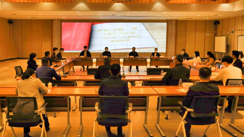 座谈会现场还播放了青春思政课《习近平与大学生朋友们》悦读时间短视频。党政办公室、宣传部、学生工作部、校团委等单位负责人、访谈实录采访组成员及师生代表参加了座谈会。