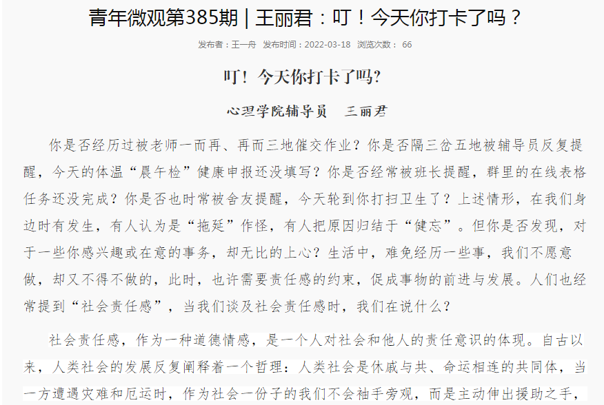 弘扬抗疫精神。3月以来,学生工作部通过微博、微信及易班、小联等平台,在“青年微观”栏目推送由师生撰写的疫情防控与爱国主义教育等主题文章215篇次,阅读量达10万余次;强化学生党员、学生干部带头遵守疫情防控规定,带头维护校园秩序,积极参加志愿服务,关心帮助身边同学,积极传播正能量。通报表扬一批343名积极参与各地联防联控工作的优秀青年学生,凝聚广大青年学生共同抗疫,让党旗在抗疫一线高高飘扬。