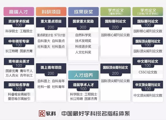 中国最好学科排名的指标体系由软科开发的学科发展水平动态监控系统内嵌的30余项测量指标组成,这30余项指标划分为10余个指标维度分别计算得分,然后归纳为高端人才、科研项目、成果获奖、学术论文、人才培养5个指标类别,最后汇总得到学科点的总分。