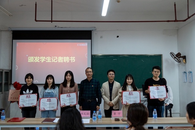 会上,郑文灿和黄宁一同为学院学生融媒体中心揭牌,并为指导老师和20名学生记者代表颁发聘书。