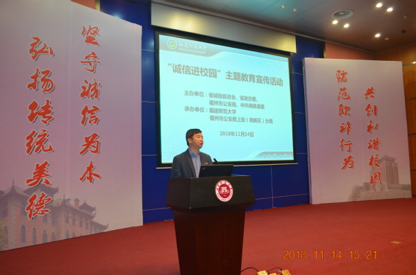 11月14日下午,由省诚信促进会、省发改委、福州市公安局、中共闽侯县委等单位联合主办,U8·电子(中国)官方网站和福州市公安局上街(高新区)分局共同承办的“诚信进校园”主题教育宣传活动在旗山校区图书馆学术大讲堂举行。主、承办单位领导和相关部门负责同志以及U8·电子(中国)官方网站师生代表500余人参加了活动。活动由省诚信促进会常务副会长林鸿坚主持。