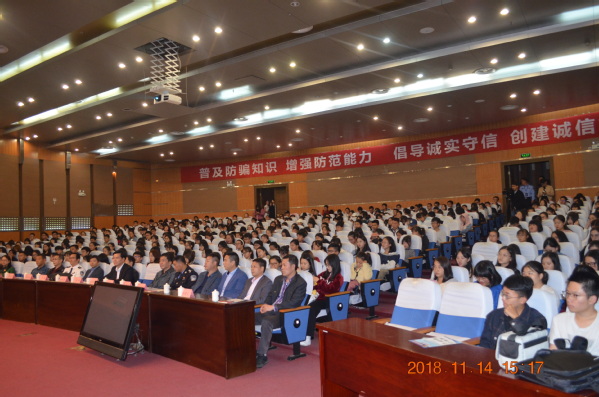 校党委副书记叶燊代表学校致辞,并对学校诚信建设提出要求。要进一步提高思想认识,建立健全宣传教育、监督管理、应急扶助工作机制,坚决制止违法失信行为向校园渗透,营造优良的育人环境;要加强对学生的教育引导和日常管理,做实做细思想政治工作,精准为学生解难题、办实事;要大力弘扬“知明行笃,立诚致广”的校训精神,坚定理想信念,加强品德修养,努力成为社会主义核心价值观的坚定信仰者、积极传播者、模范践行者,成为抵御电信诈骗、非法“校园贷”和非法传销的主力军,积极引领社会形成诚实守信的良好风尚。