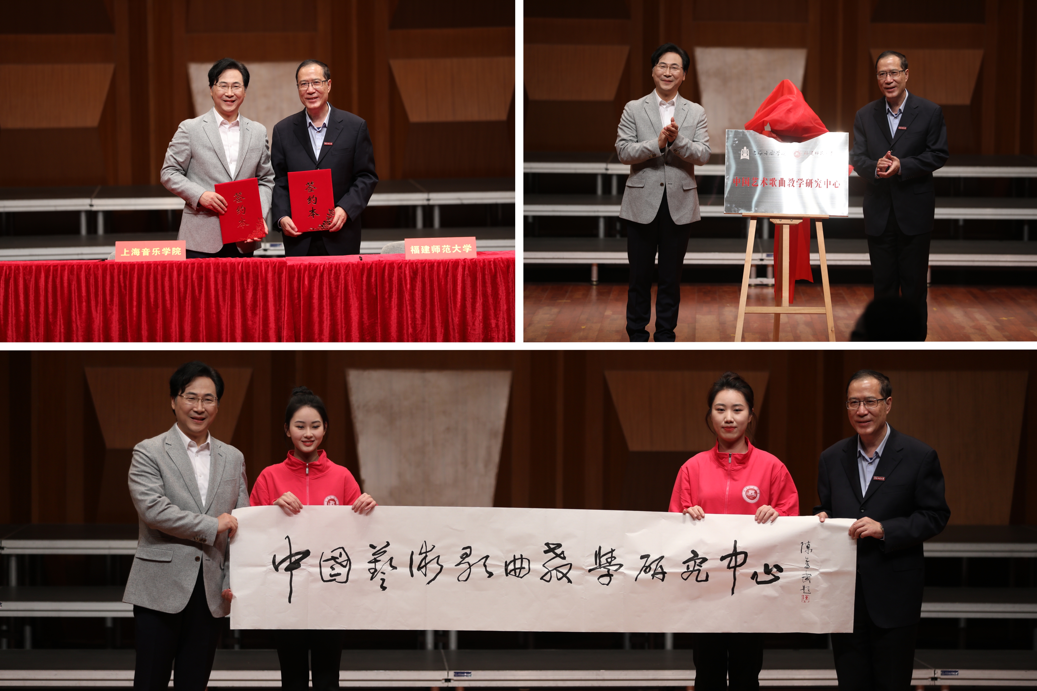 在与会人员的共同见证下,廖昌永和王长平分别代表两校签订战略合作协议,并共同为“中国艺术歌曲教学研究中心”揭牌。中心也得到了福建省书法家协会主席陈奋武先生的题词。