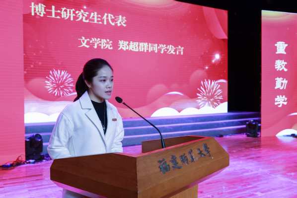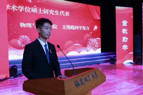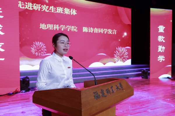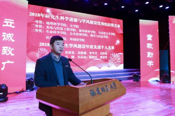 校党委副书记叶燊、副校长郑家建宣读了获表彰名单。地理科学学院陈诗音同学代表先进集体发言,文学院郑超群同学、物理与能源学院王伟煌同学和社会历史学院洪逸威同学分别代表博士研究生、学术学位研究生和专业学位研究生发言。与会领导为获奖研究生先进集体和个人代表颁奖。