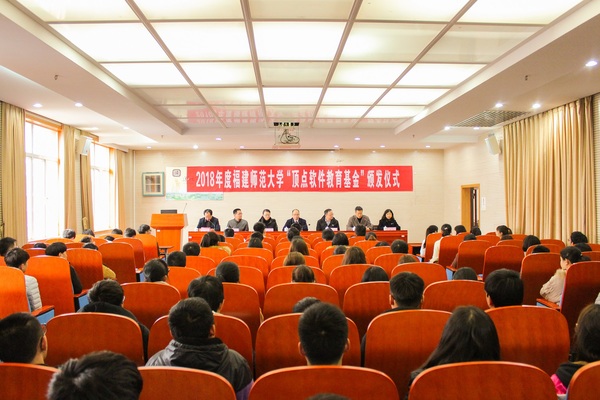 颁发仪式于2019年1月2日下午在旗山校区数信大楼学术报告厅举行。顶点软件股份有限公司副总裁赵伟、人力资源总监程佳,校纪委书记黄清波,学生工作部(处)负责人、数学与信息学院党政负责人、师生代表和受奖助学生参加了颁发仪式。