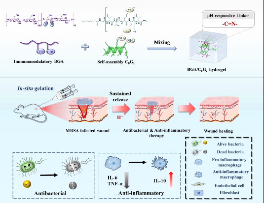 Bacterial infections and excessive inflammation can impede the healing of wounds. Hydrogels have emerged as a promising approach for dressing bacterial-infected injuries. However, some antibacterial hydrogels are complex, costly, and even require assistance with other instruments such as infrared light, making them unsuitable for routine outdoor injuries. The work, entitled “An Additive-Free Multifunctional β-Glucan-Peptide Hydrogel Participates in the Whole Process of Bacterial-Infected Wound Healing”, was published in the top medical journal Journal of Controlled Release. The research reports an in-situ generating hydrogel constructed from oxidized β-D-glucan and an amphiphilic antimicrobial peptide. This hydrogel is easily accessible and actively contributes to the whole healing process of bacteria-infected wounds through antibacterial activity and and immunomodulatory activity inherent in the two-component system. The reversible imine bond enables the hydrogel to sustainably release the antibacterial peptide and inflammation-regulating β-D-glucan around the wound tissue, inhibiting the release of excessive inflammatory factors while promoting the release of anti-inflammatory factors, and thus accelerating wound healing. Meanwhile, the wetness and network structure inherent in the hydrogel make it capable of stopping bleeding and promoting cell migration. In methicillin-resistant Staphylococcus aureus (MRSA)-infected full-thickness skin wound models, the hydrogel showed superior antibacterial and anti-inflammatory activity, and expedited wound healing. The hydrogel also inhibited the expression of inflammatory factors and promoted the production of anti-inflammatory factors in vivo, while enhancing M2 macrophage polarization and accelerating epidermal tissue regeneration. These features make this hydrogel an appealing wound dressing for treating multi-drug-resistant bacteria-infected wounds.