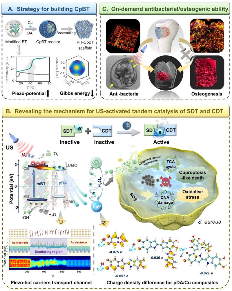 To address the issue of bone implant infections, Professor Zhang Xianzeng’s team of College of Photonic and Electronic Engineering of FNU, have further proposed an ultrasound-activated piezoelectric intelligent nanoreactor based on their previous work on the ultrasound-piezoelectric regulation mechanism of piezoelectric sonosensitizers (Adv. Func. Mater., 2023, 33: 2210726). The nanoreactor amplifies the efficacy of sonodynamic and chemodynamic therapy on bacterial infections of bone implants through spatiotemporal ultrasound-driven tandem catalysis. By combining piezoelectric barium titanate with polydopamine and Cu ions, the ultrasound-activated piezo-hot carriers transfer easily to copper by “electron aspirator” polydopamine, which boosts reactive oxygen species production by piezoelectrics, and facilitates the interconversion between Cu2+ and Cu+ to promote hydroxyl radical generation via Cu+-catalyzed Fenton-like reactions. And the elevated reactive oxygen species cause bacterial membrane structure loosening and DNA damage. Therefore, the 3D-printed polyetherketoneketone bone scaffold engineered with the designed nanoreactor shows excellent antibacterial performance with ultrasound stimulation and promotes angiogenesis and osteogenesis on-demand in vivo with great clinical application potential. The strategy is expected to provide implants with ultrasound-regulated antibacterial and osteogenic capabilities, and offer a new approach for the treatment of implant infections.