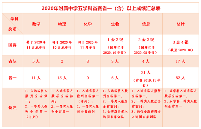 近日,附属中学在2020年福建省中学生信息学、生物、物理、化学、数学竞赛中取得佳绩,累计获得一等奖62项,获奖人数高居榜首,在省内学校中遥遥领先;入选省队人数总计17人,位居全省第一。近年来,附属中学顺应新高考背景,大力推进“学科竞赛工作室”,在学科竞赛教练辛勤耕耘、竞赛生的不懈探索以及学校上下的有力保障之下,学科竞赛成绩不断提高。(附属中学)